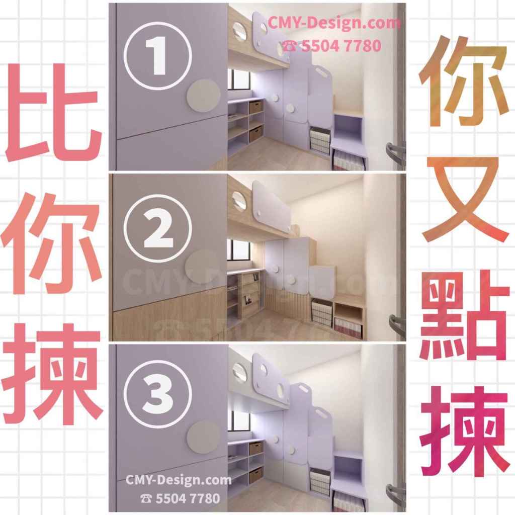 最近 CMY DESIGN 團隊就為一單位客人設計全屋傢俬,當中一間小朋友房,客人表示要紫色色調的床。紫色給人一種寧靜祥和的感覺,亦可為整個環境帶來活力。客人表示房間要擺小朋友既圖書、玩具,收納空間要夠多。有見及此,CMY DESIGN 就根據用戶提出的因素,提供三個設計方案,以供用戶參考。