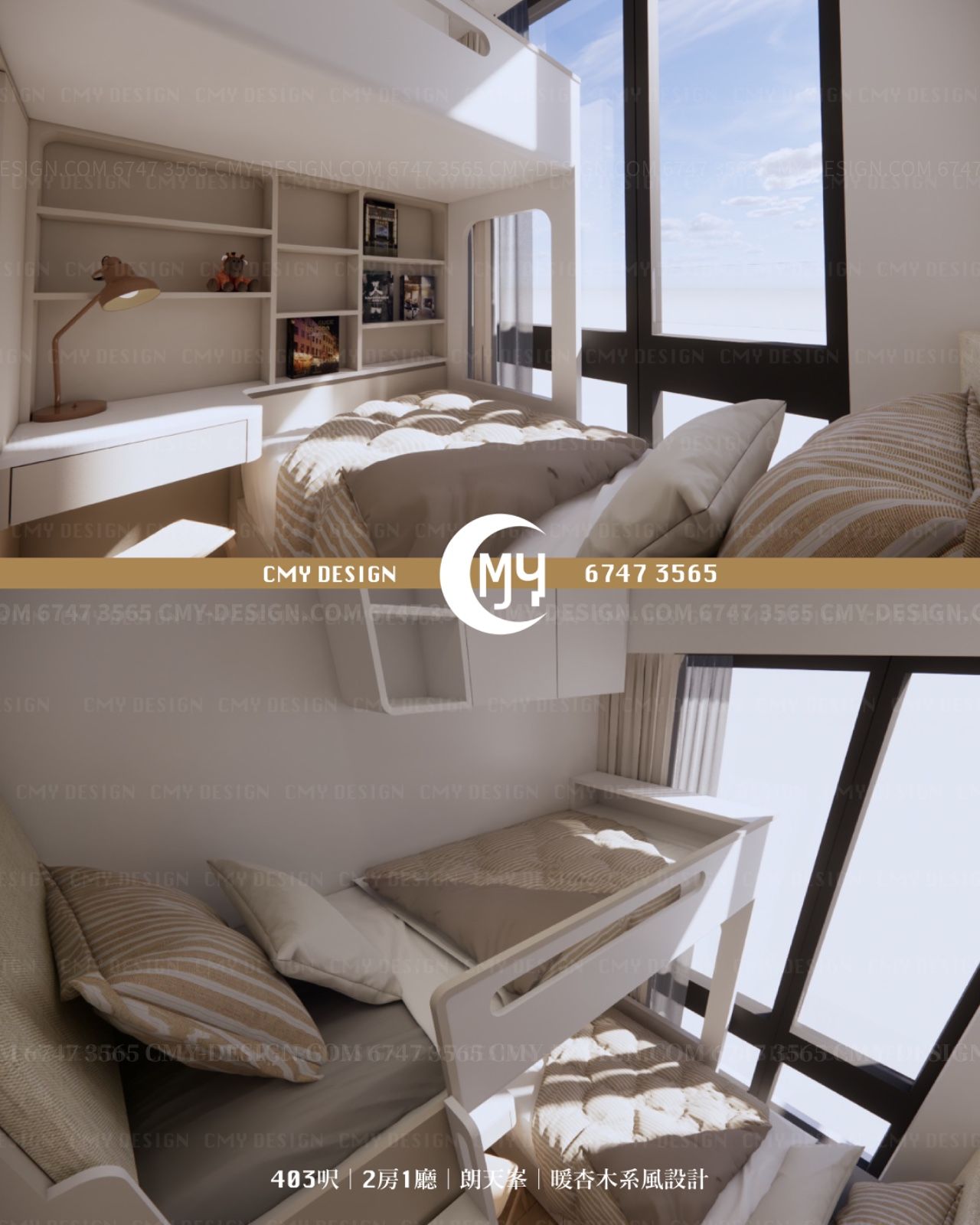兒童房採上床下床設計,下層床背牆加入大容量書架及小書枱,做功課、看書都好方便。 上層床舖靠窗享自然光,梯身同樣預留儲物格,細房同時滿足睡眠、學習與收納需要。